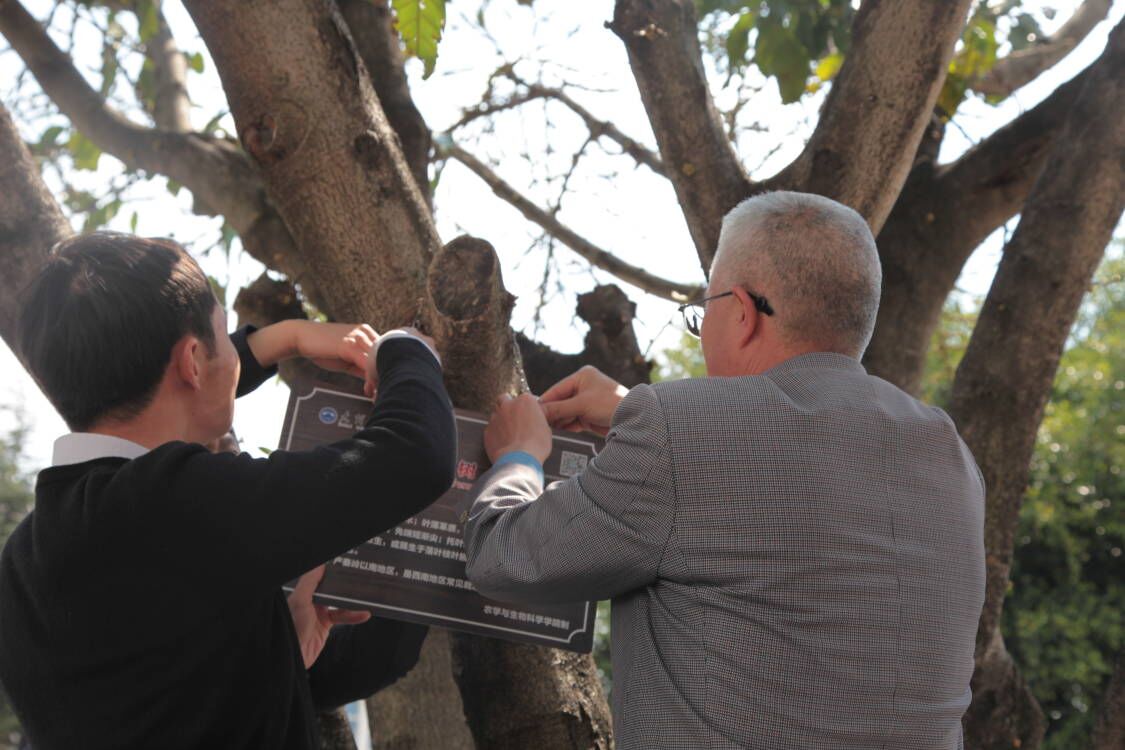 随后,师生共同为校园植物挂牌。经全面普查校园树木物种,共制作127种511块植物牌,标牌信息准确全面,包含植物名称、所在科属、生态习性和树种二维码。从前期校园植物实地调查、分类、统计,到后期树牌设计制作,凝聚了专业教师和学生的辛苦和智慧。同时,在专业教师的指导下,志愿者们手持修剪工具,配合默契,干劲十足,通过对病虫枝、干枯枝、阴生枝、偏冠和过密的树枝修剪,保障树木健康生长,使树木具有良好观赏价值。