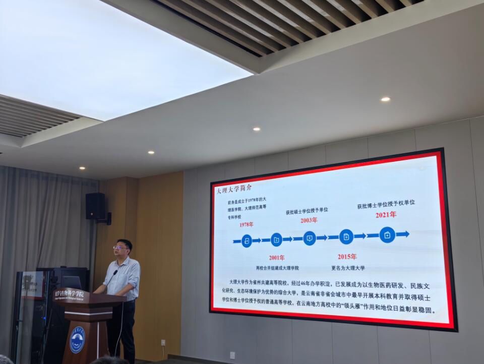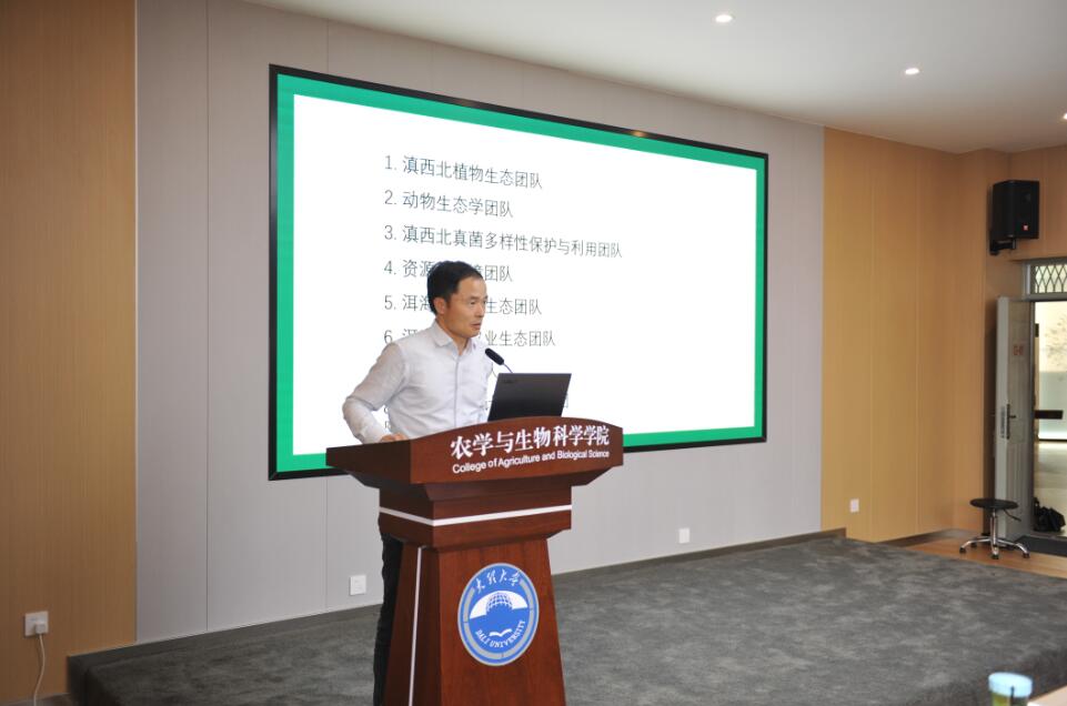 胡小康院长对学院滇西北植物生态团队、动物生态学团队、滇西北真菌多样性保护与利用团队、资源与环境团队、洱海流域水生态团队、洱海流域农业生态团队、分子生态团队和生物信息与计算生物学团队等8个科研团队做了详细介绍,鼓励新生勇于探索未知,积极投身学习与实践,激发了他们对科学研究的兴趣。